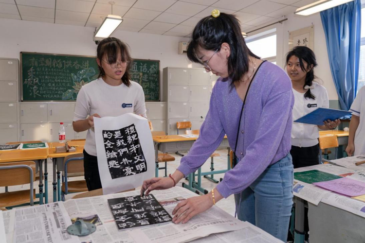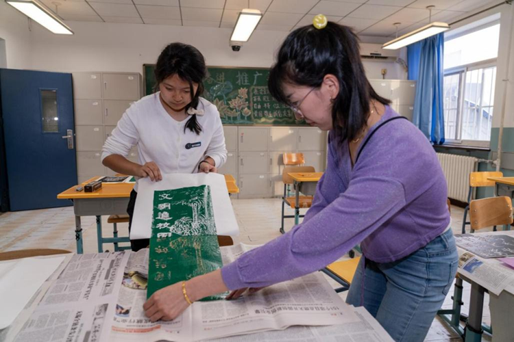 9月25日,天津大学附属中学的师生们正在课外活动中学习体验版画传统技艺。新华网 钟奕 摄