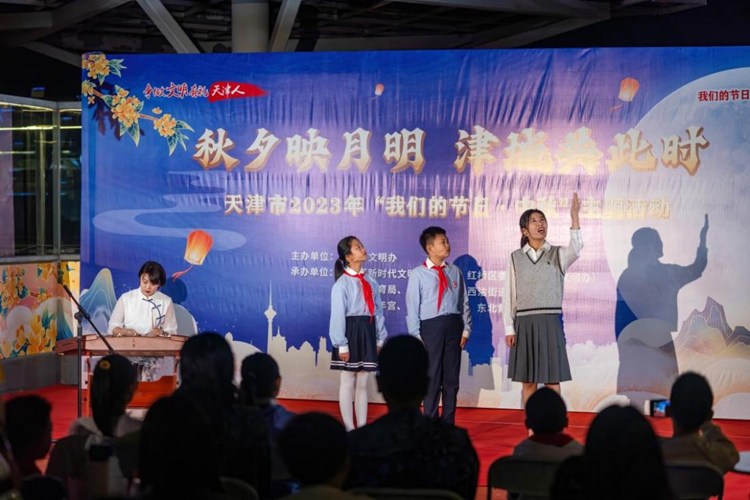 9月26日,天津市红桥区少年宫举办“我们的节日·中秋”主题活动,同学们正在表演小品。新华网 钟奕 摄
