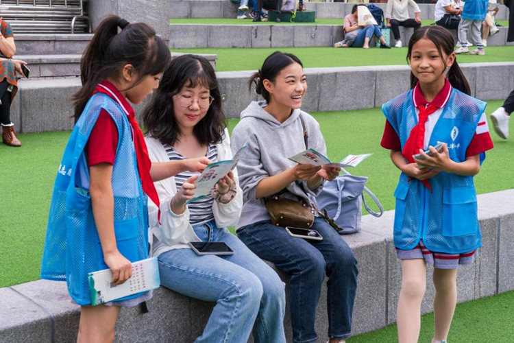 9月27日,来自天津市和平区新华南路小学的小志愿者们在天津市五大道文化旅游区向游客宣传“争做文明有礼天津人”。新华网 钟奕 摄