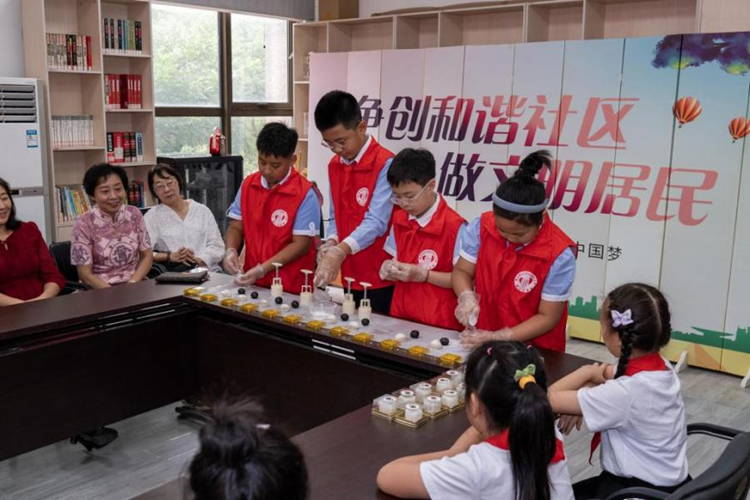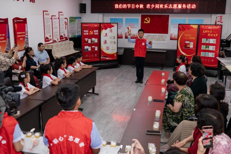 9月25日,天津市梧桐小学的“桐心志愿者”在天津市河西区溪水园社区新时代文明实践站开展“我们的节日中秋 老少同欢乐志愿服务活动”。图为小志愿者们在为社区居民奉上刚刚制作的月饼。新华网 钟奕 摄