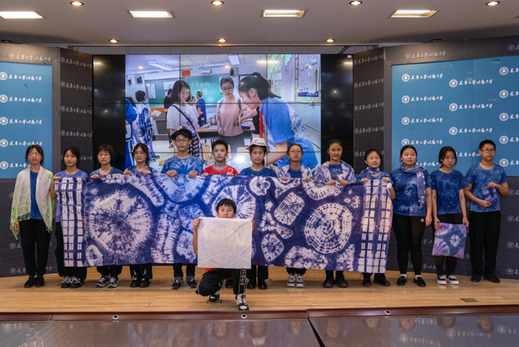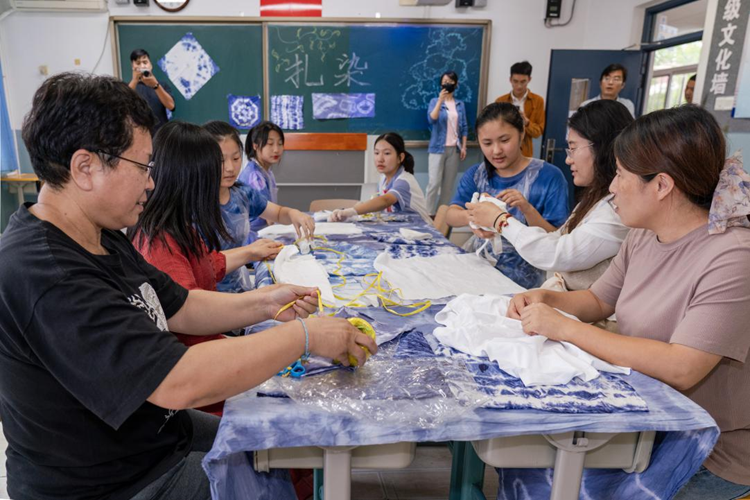 9月25日,天津大学附属中学的师生们正在课外活动中体验扎染传统技艺。新华网 钟奕 摄