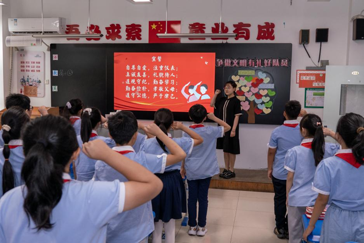 9月25日,天津市梧桐小学各班级开展“争做文明有礼好队员”主题班会活动。图为老师和同学们正在进行宣誓。新华网 钟奕 摄