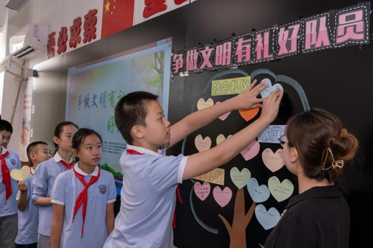 9月25日,天津市梧桐小学各班级开展“争做文明有礼好队员”主题班会活动。图为同学们正在黑板上粘贴文明寄语。新华网 钟奕 摄