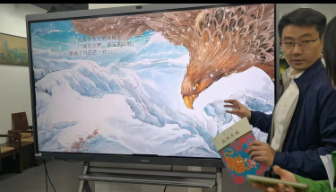 来到大屏互动绘本体验系统前,触摸屏幕上的人物、动物、景物,不仅能聆听图书内容的朗读,还能进行场景互动,让静态的纸质绘本“动”起来、“唱”出来,科技体验感十足。