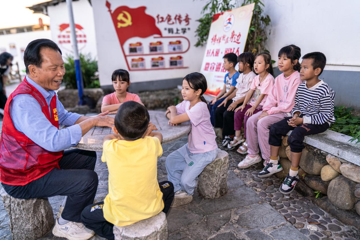 11月1日,“中国好人”谢凯庆在广西梧州市岑溪市归义镇金坡村进行志愿服务,为小朋友讲述助人为乐的小故事。新华网 钟奕 摄