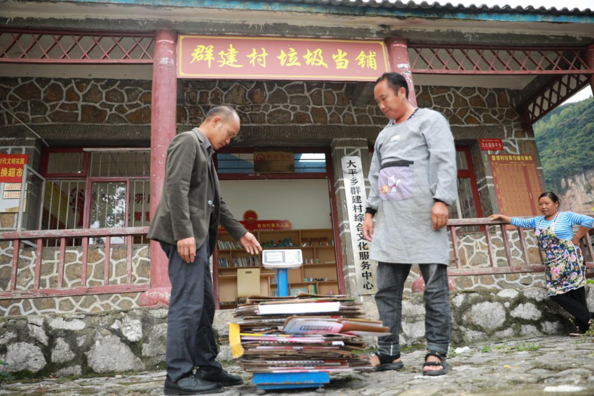 在群建村的“垃圾当铺”里,食盐、味精、牙膏、牙刷、香皂、卫生纸等生活必需品琳琅满目,村民们正提着可回收垃圾依次兑换物品。