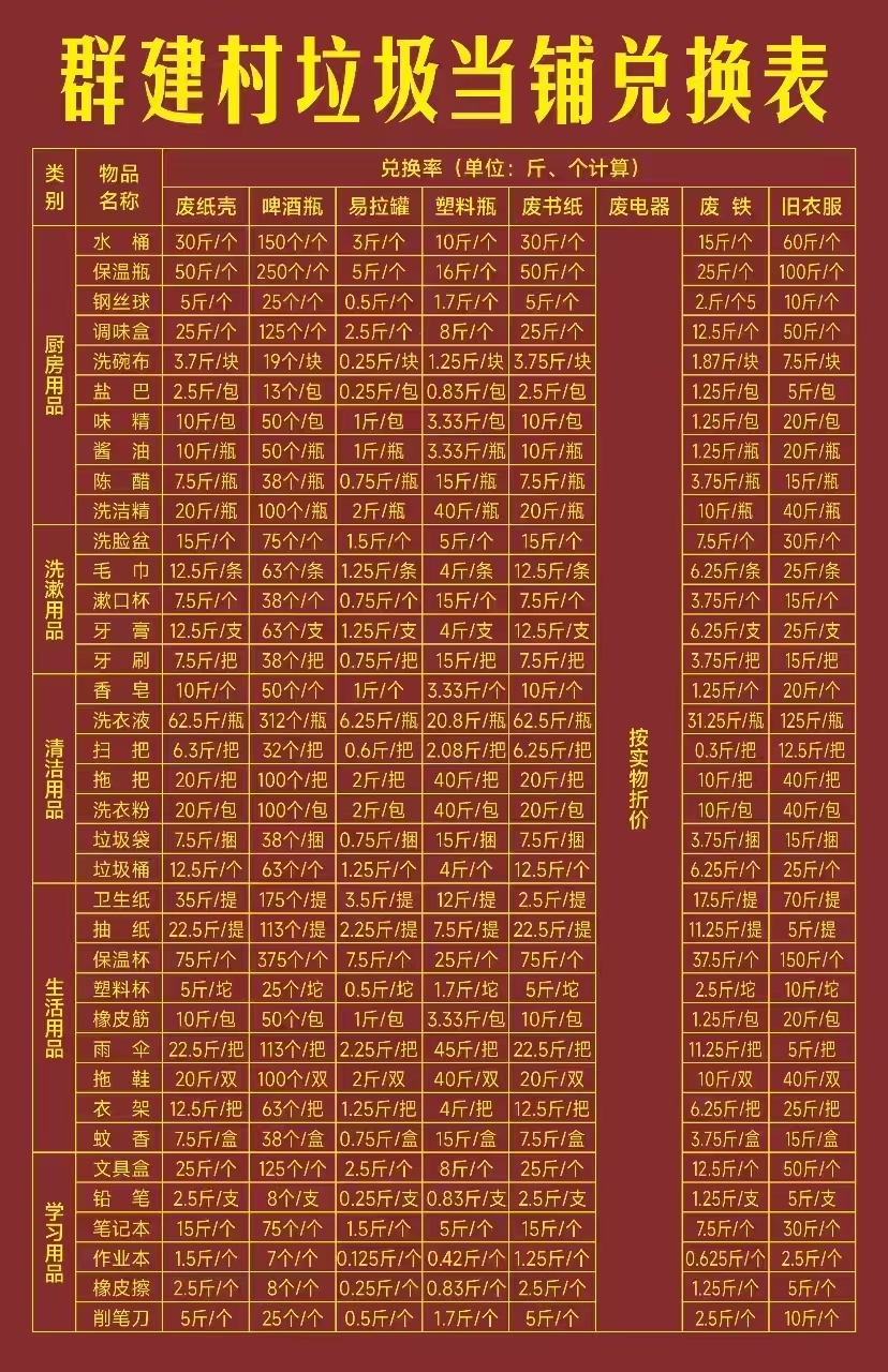 杨进明所说的“垃圾当铺”,是群建村为实现垃圾“变废为宝”专门实行的一套激励机制。引导村民用塑料袋、废纸盒、旧衣服等垃圾兑换日常生活用品,既实现了废旧物品的循环利用,又达到引导群众自觉养成文明卫生习惯的目的,走出一条农村环境卫生整治与育民惠民相融合的改革新路子。