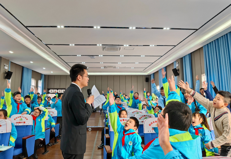 射洪市人民法院萤火虫志愿服务队志愿者到小学开展普法宣讲。射洪市文明办供图