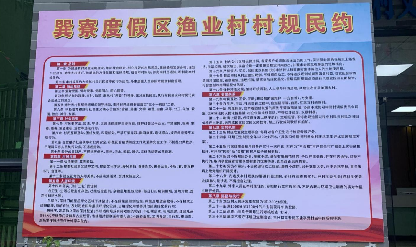 二是干部联片。渔业村充分发挥基层党建作用,落实渔业村村“两委”干部分片包干制度,组织群众学习移风易俗相关政策和法规,同时巽寮度假区安排8名驻渔业村工作干部联片包干,指导和督促渔业村移风易俗重点工作落实,协助修订和完善红白理事会章程、村规民约,大力推介移风易俗先进典型。