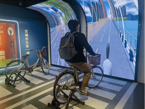 在达州市渠县青少年法治教育基地的交通安全体验区,市民正在体验骑行互动答题(11月2日摄)。新华网发(罗园摄)