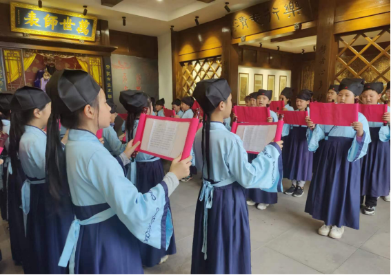 11月2日,在达州市渠县文峰书院,身着汉服的孩子们正在齐声诵读《文明中国》。新华网 李然 摄