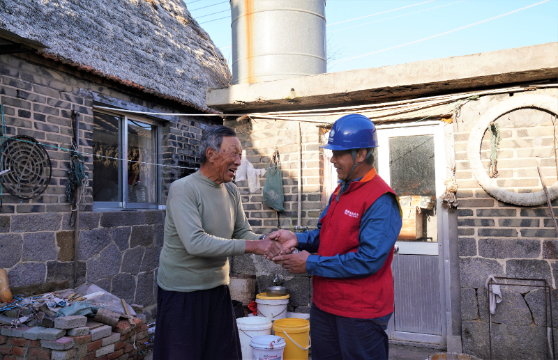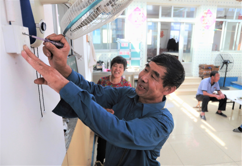 孙涛为村民检修电器设备,村民表示感谢。山东省文明办供图