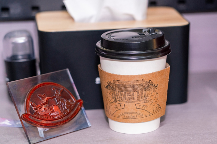 东莞市虎门镇新时代文明实践中心的志愿服务专属咖啡托印章(左)和可以DIY印制的自助冲调咖啡防热套(右)(2023年12月13日摄)。新华网 钟奕 摄