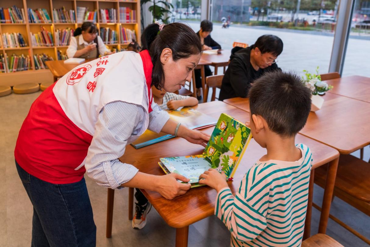 2023年12月14日,广东省深圳市龙华区新时代文明实践中心学习社,志愿者正在陪同小朋友在一起学习科普读物。新华网 钟奕 摄