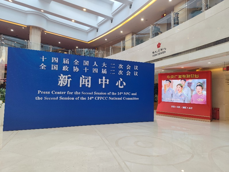 位于梅地亚中心的十四届全国人大二次会议、全国政协十四届二次会议新闻中心大厅。原茵 摄