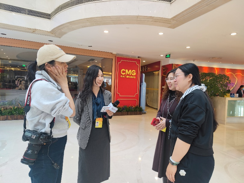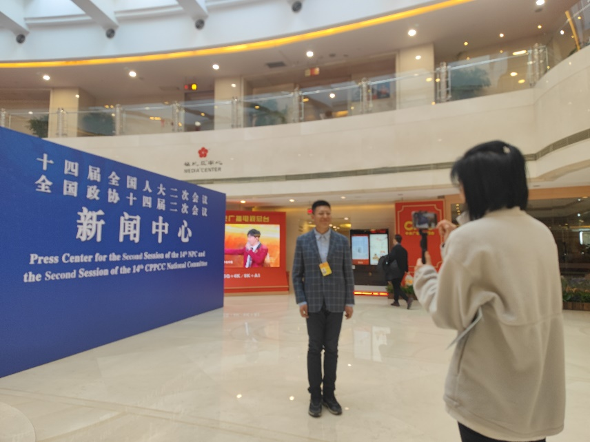 参加全国两会报道的媒体记者在十四届全国人大二次会议、全国政协十四届二次会议新闻中心的背景板前录制报道视频。原茵 摄