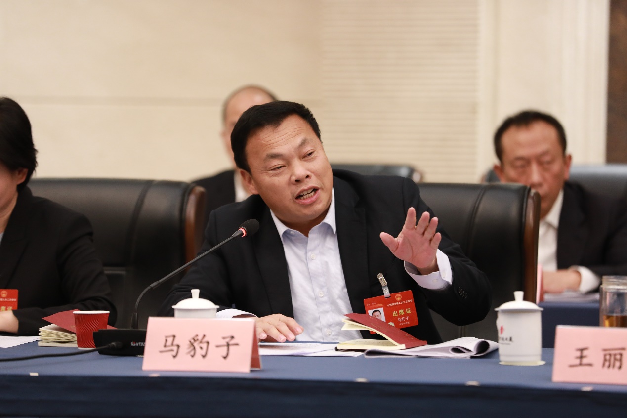 全国人大代表,河南省平顶山市宝丰县赵庄镇大黄村党支部书记马豹子在河南省代表团小组讨论会上发言。原茵 摄
