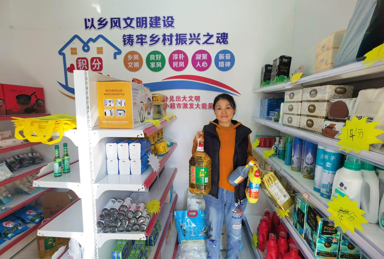 “家里的食用油快吃完了,来‘积分超市’兑换一桶油。”“家里水壶坏了,我想用我攒的积分换一台电热水壶……”在前进村里的“积分超市”内,村民们拿着一本本积分册,依次有序地兑换物品。