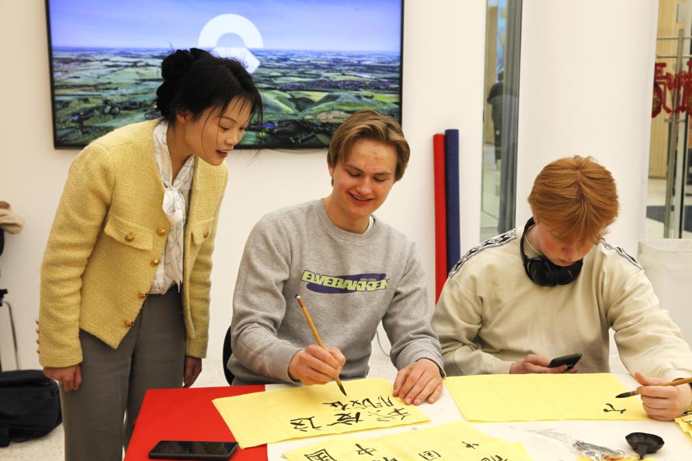 4月20日,在挪威首都奥斯陆,当地民众在中文日庆祝活动上体验书法。新华社记者张玉亮 摄
