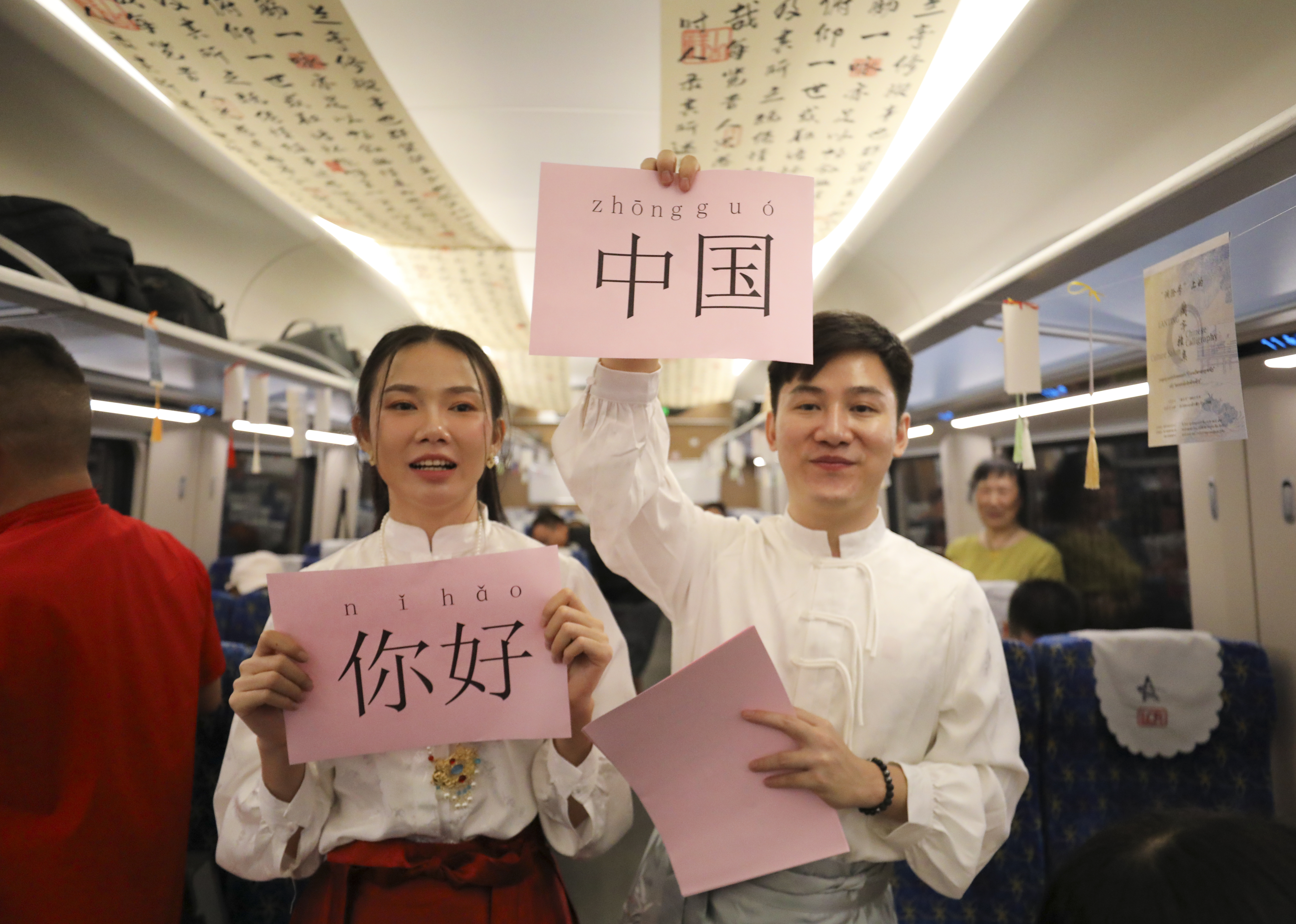 中老铁路D88次国际旅客列车5号车厢被装扮一新,两幅25米长的《兰亭集序》书法长卷高挂在车厢顶部,古色古香的中国书法作品挂画在车厢内随处可见。乘客在座位上专注地用毛笔一笔一画写下中国汉字,浓浓的文化气息弥漫在车厢的每个角落……