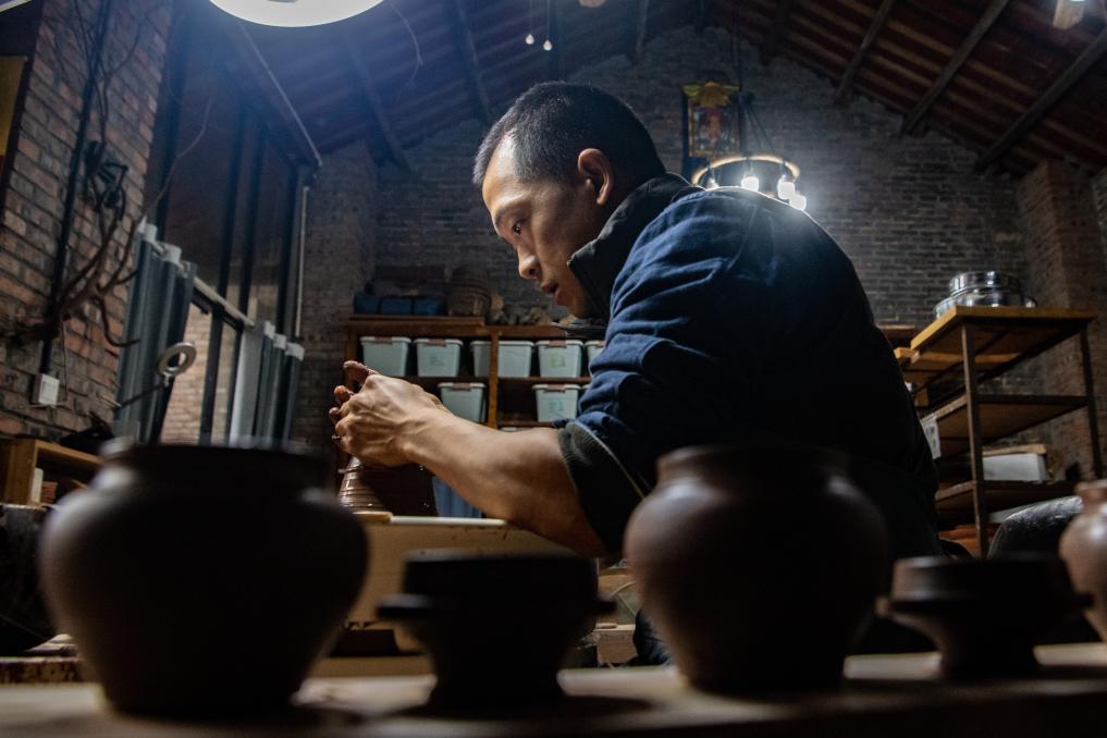 管永双在“西山雨”陶艺工作室内进行陶艺制作。新华社记者唐奕 摄
