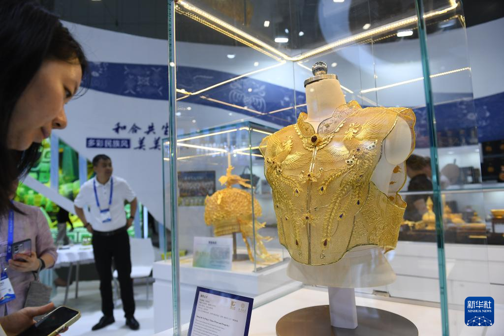 5月23日,观众在第二十届文博会上观看展出的龙凤霞帔金衣。当日,为期5天的第二十届中国(深圳)国际文化产业博览交易会开幕。本届文博会设8个展馆,共有超6000家政府组团、文化机构和企业参展,展出文化产品超过12万件,4000多个文化产业投融资项目在现场进行展示与交易。展会期间,还将举办会议、论坛、签约、创意大赛等配套活动。新华社记者 毛思倩 摄