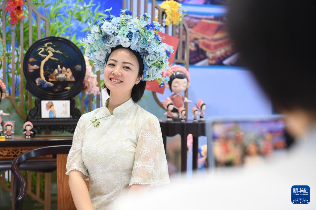 5月23日,参观者在第二十届文博会福建馆体验簪花。新华社记者 毛思倩 摄