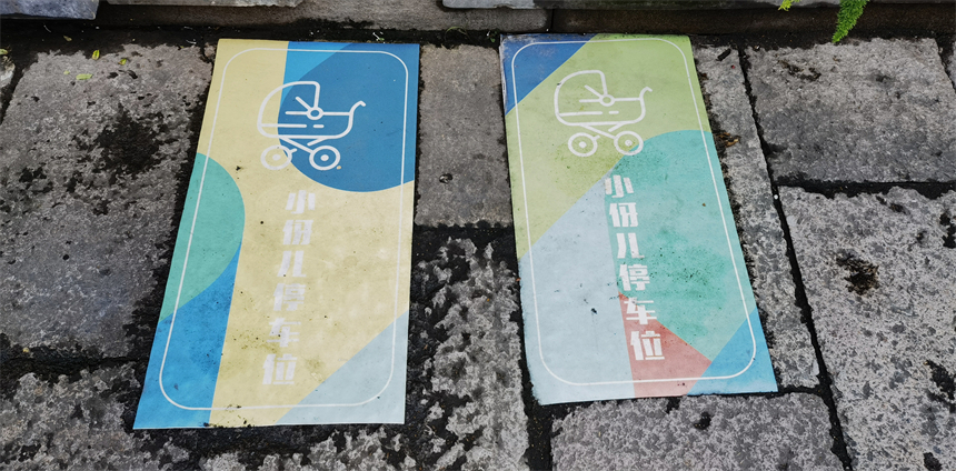 杭州首个儿童友好街区——桥西文明实践街区专门规划的“小伢儿停车位”。新华网 李雪芹 摄