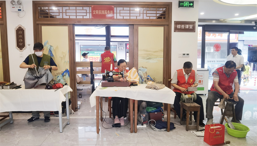 志愿者们正在“庙街拾铺”内为居民做志愿服务。新华网 李雪芹 摄