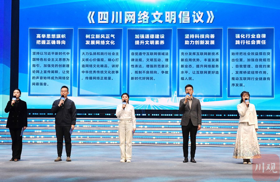 “以时代新风塑造和净化网络空间,共建网上美好精神家园。”2023年12月,在四川省网络文明建设暨走好网上群众路线活动上,来自互联网不同领域的5名代表共同宣读了《四川网络文明倡议》。倡议背后,是四川扎实推进网络文明建设的生动实践。