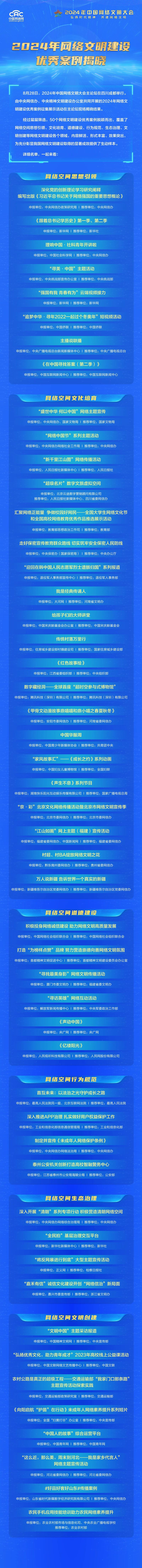 为充分发挥优秀案例在促进网络文明建设中的示范引领作用,中央网信办、中央精神文明建设办公室共同开展了2024年网络文明建设优秀案例征集展示活动,经过层层筛选,共推选出50个网络文明建设优秀案例。8月28日举行的2024年中国网络文明大会上,50个优秀案例正式对外发布。