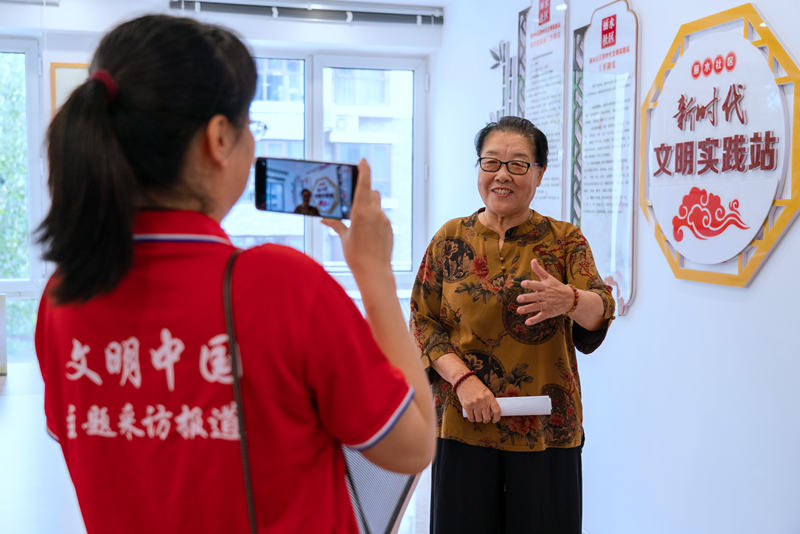 8月21日,“文明中国”主题采访报道组记者正在河北省承德市双桥区丽水社区新时代文明实践站采访参加文化活动的居民。钟奕 摄