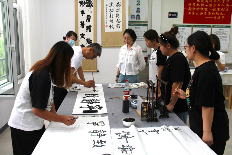 呼和浩特市回民区奔腾社区的居民在社区党群服务中心交流学习书法 新华网发(呼和浩特市融媒体中心记者王中宙 摄)