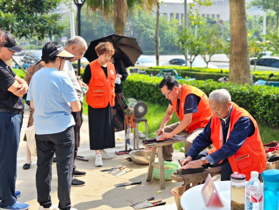 在平湖市当湖街道友邻中心门口,采访报道组成员们被热闹温馨的场景所吸引。洗眼镜、量血压、磨菜刀、小家电修理等服务项目,吸引了众多居民参与。重阳节当天,“叶跃平志愿服务队”为社区居民送上特别的节日礼物。“今天一早我们就来啦,这已经是我修的第3个锅了。”志愿者叶跃平身穿橙色马甲,正在修理居民送来的锅碗瓢盆。20多年志愿服务的坚持和热爱,使他成为社区居民心中的“明星”。