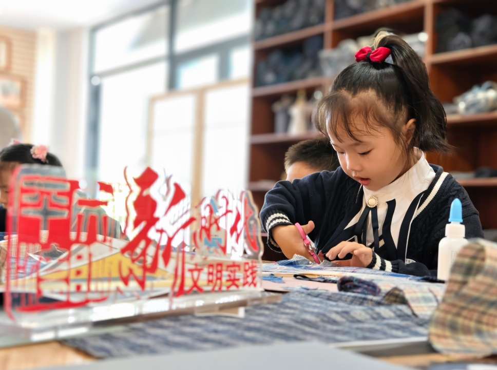 在经济发展的同时,沈家弄村还探索文明生活方式,挖掘传统民俗和知青文化,打造具有江南特色的“钟溪棹歌·隐世田园”风景线,使村子既现代又不失江南韵味。在杜经布文化展示馆,钟埭幼儿园的焦兴燕老师,带领大班孩子们一起制作杜经布贴画,传承非遗文化,让孩子们更深入地了解平湖特色文化。