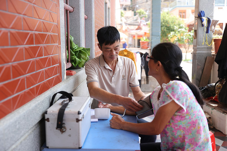 9月12日,“中国好人”、泉港区南埔镇惠屿岛上乡村医生肖锦璋正在为上门就诊的村民诊疗。颜财斌 摄
