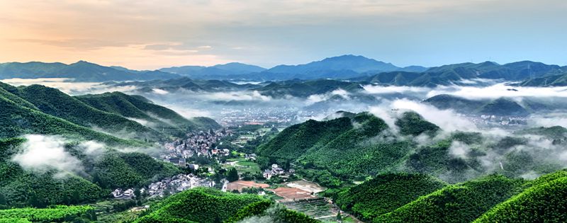 浙江省湖州市安吉县天荒坪镇余村,飘逸的云朵在竹海上升腾,民居与青山层叠相拥,构成一幅美丽的生态画卷。新华网发 (潘学康 摄)