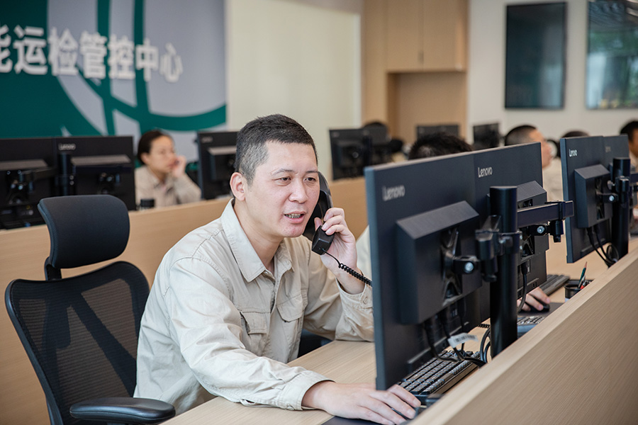 苏华在监控大厅接听抢修电话。常州市文明办供图