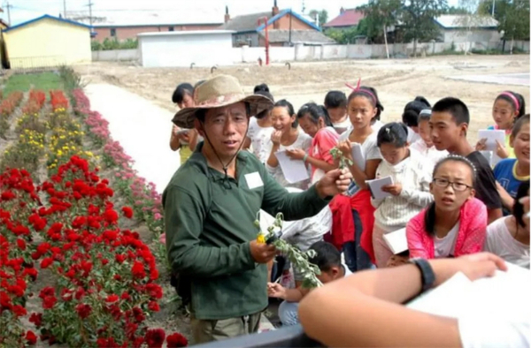 李荣富带领学生开展野生植物科普教学。吉林省文明办 供图
