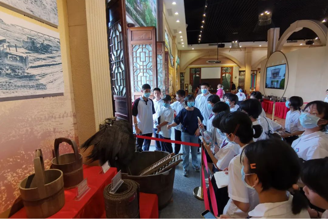 学生们正在参观莘村村史馆禾海稻浪水稻田文化主题园农耕文化展示专区。