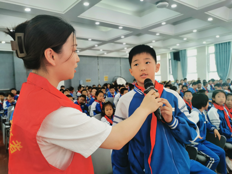 在“文明上网·快乐童行”主题活动中,小学生回答网络文明志愿者的提问。兰州文明网供图