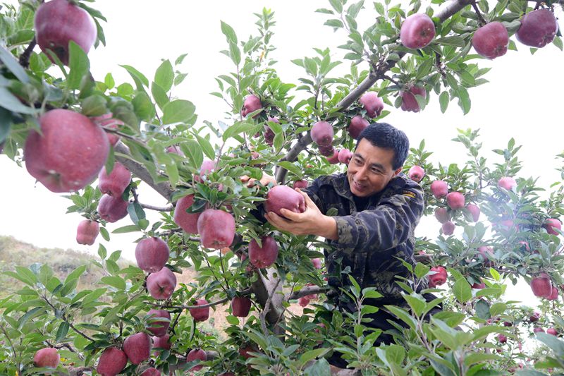 天水“花牛苹果”享誉国内外。近年来,天水市持续推进果业迭代升级,着力打造现代山地特色农业示范区,为全面推进乡村振兴奠定坚实产业基础。图为天水市果农采摘“花牛苹果”。(天水市文明办供图)