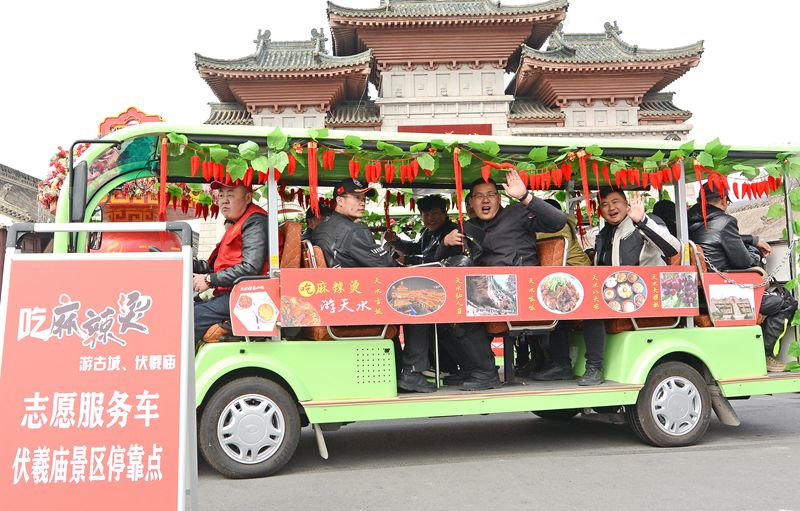 “天水麻辣烫”火爆以来,天水市奋力开展了一场“麻辣烫”长红与城市文明相互成就的“双向奔赴”,实现了流量经济、城市文明程度双提升。图为天水市组织的志愿服务车在伏羲庙接送外地游客。(天水市文明办供图)