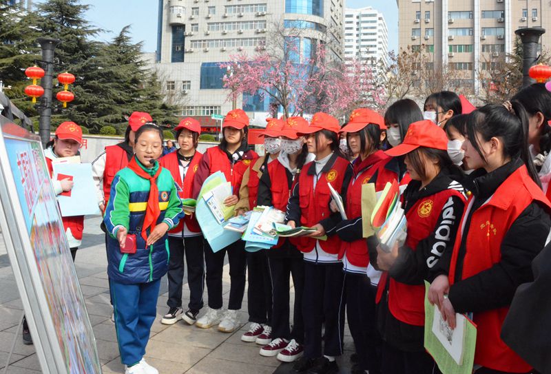 天水市扎实开展“志愿同心•服务同行”学雷锋文明实践我行动主题活动,志愿服务活动遍及城乡,志愿服务理念日益深入人心。图为志愿者在观看学习志愿服务展板。(天水市文明办供图)
