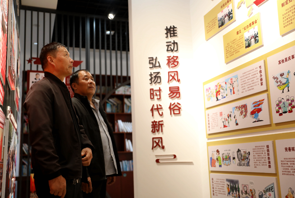 村民在新时代文明实践站参观移风易俗主题宣传墙。