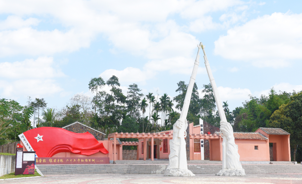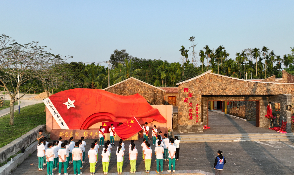 孩子们在南田起义旧址门前的红旗下宣誓。