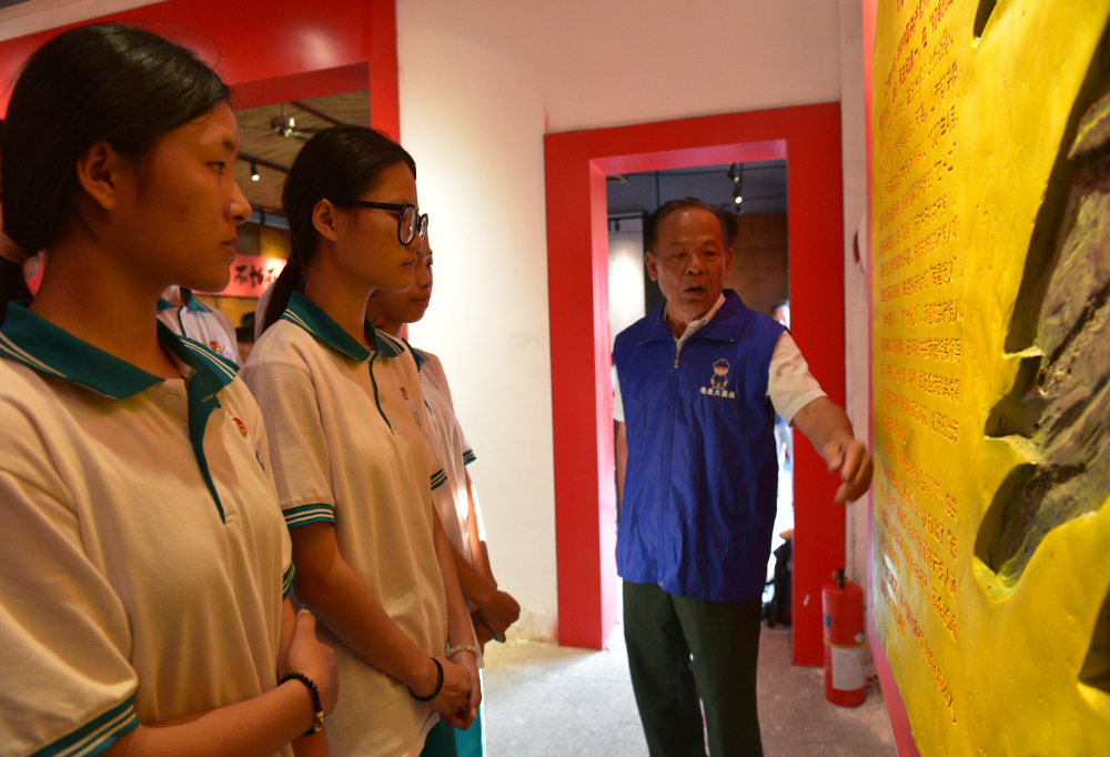 志愿者邱天富正在给孩子们介绍南田起义革命历史。