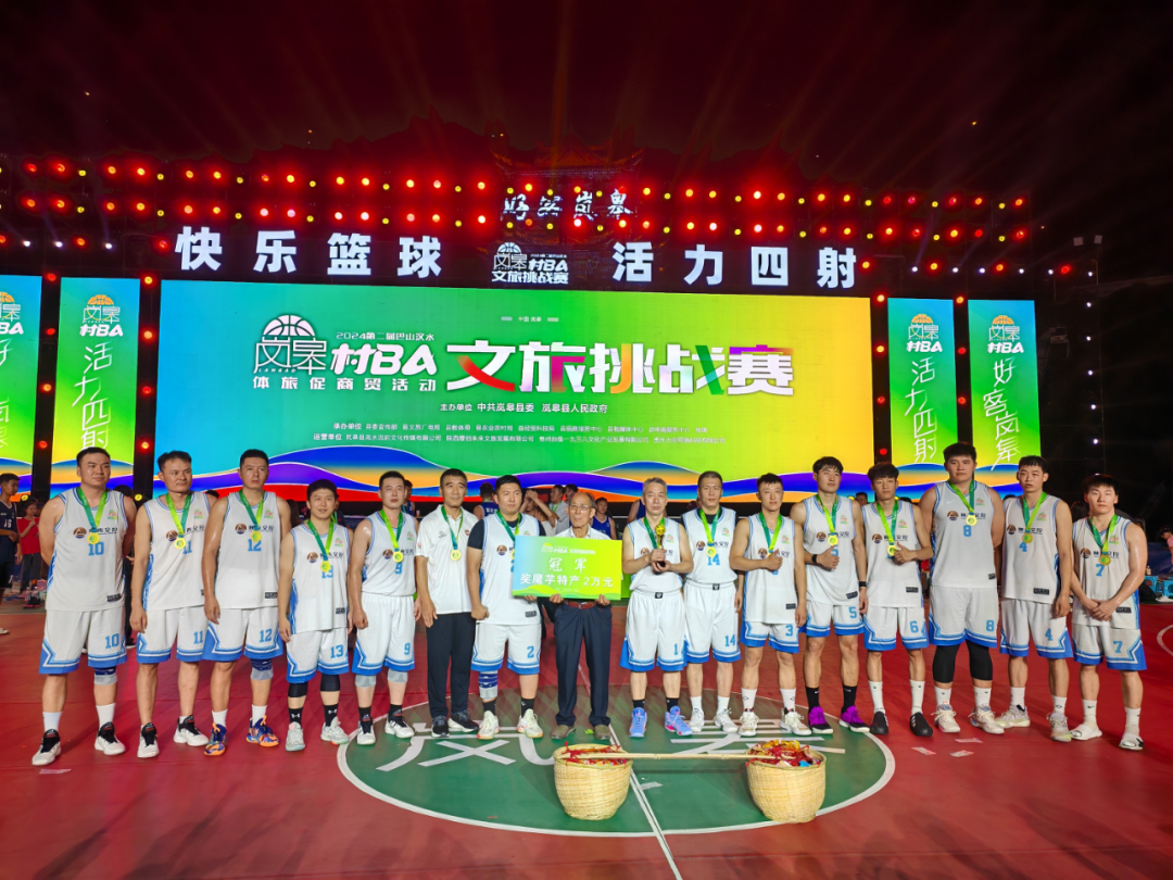 第二届巴山汉水“陕西村BA”第二阶段冠军颁奖仪式。曾荣获“中国好人”、陕西省第六届道德模范、“陕西好人”等荣誉称号的“诚信老爹”刘照元上台为冠军颁奖。岚皋县创文办供图