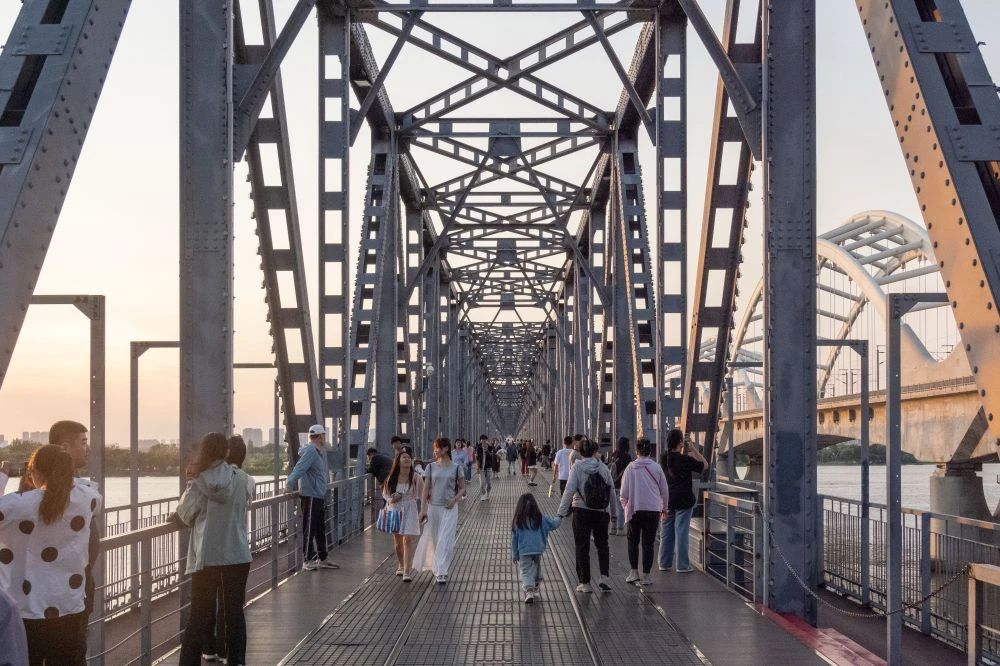 2024年6月4日,人们在哈尔滨市被称作“老江桥”的滨州铁路桥上游玩。新华社记者 谢剑飞 摄