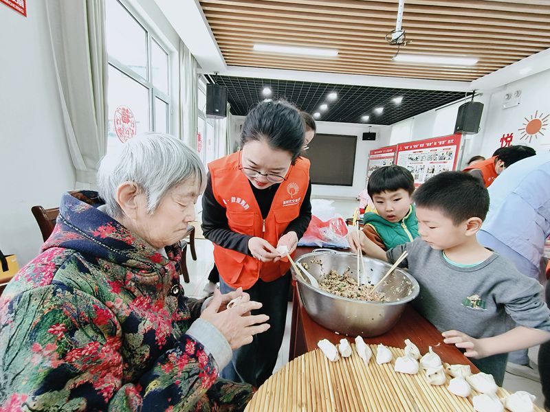潍坊高密市新时代文明实践志愿者与社区居民一同包水饺、唠家常。新华网发(潍坊高密市文明办供图)